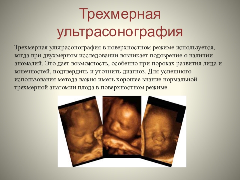 исследовании возникает подозрение о наличии аномалий. Это дает возможность, особенно при пороках развития лица и конечностей, подтвердить и уточнить диагноз. Для успешного использования метода важно иметь хорошее знание нормальной трехмерной анатомии плода в поверхностном режиме.