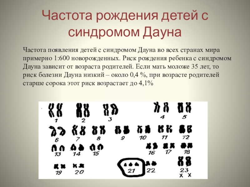 во всех странах мира примерно 1:600 новорожденных. Риск рождения ребенка с синдромом Дауна зависит от возраста родителей. Если мать моложе 35 лет, то риск болезни Дауна низкий – около 0,4 %, при возрасте родителей старше сорока этот риск возрастает до 4,1%
