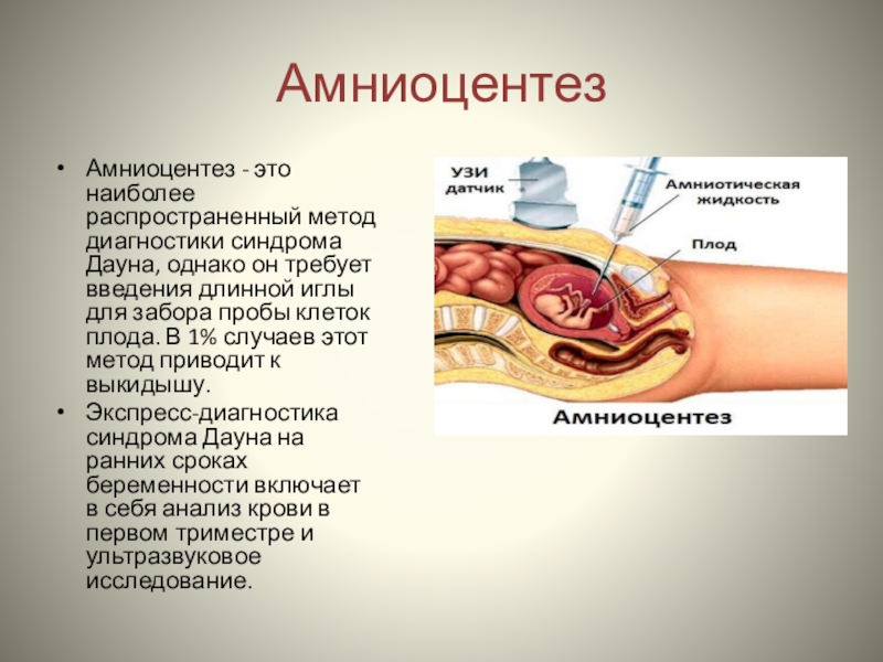 Амниоцентез - это наиболее распространенный метод диагностики синдрома Дауна, однако он
