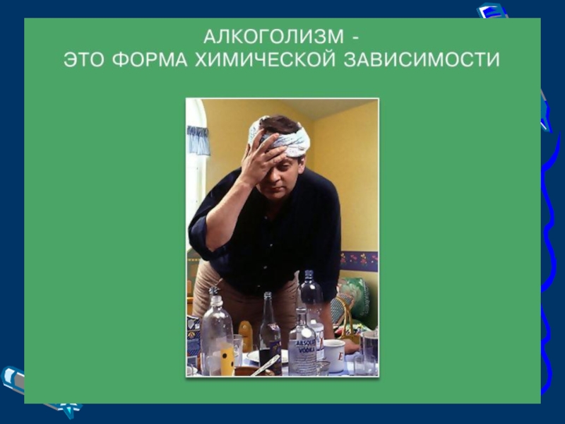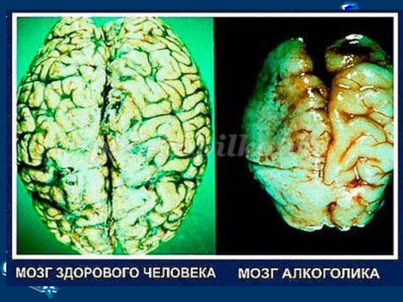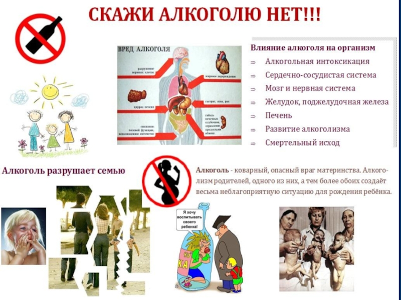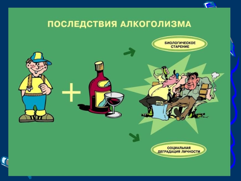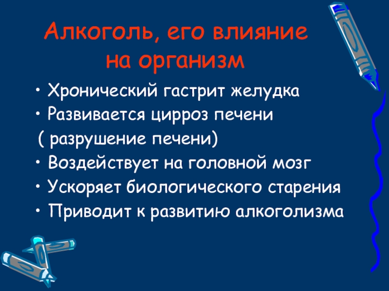Алкоголь, его влияние на организмХронический гастрит желудкаРазвивается цирроз печени ( разрушение печени)Воздействует на головной мозгУскоряет биологического старенияПриводит