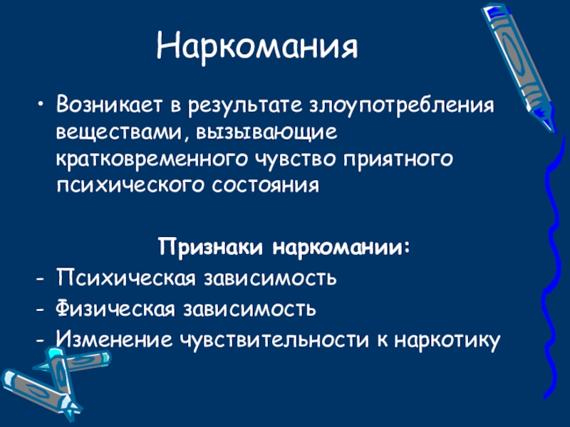 Наркомания Возникает в результате злоупотребления веществами, вызывающие кратковременного чувство приятного психического состояния Признаки наркомании:Психическая зависимостьФизическая зависимостьИзменение чувствительности
