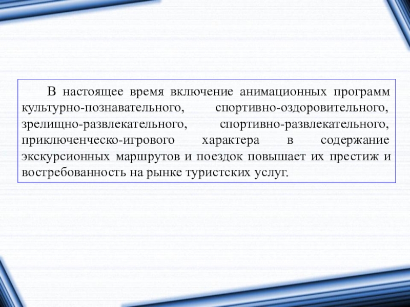 Слайд 12В настоящее время включение анимационных программ культурно-познавательного, спортивно-оздоровительного, зрелищно-развлекательного, спортивно-развлекательного, приключенческо-игрового