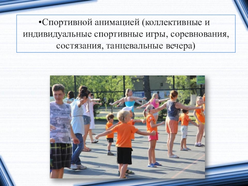 Слайд 6Спортивной анимацией (коллективные и индивидуальные спортивные игры, соревнования, состязания, танцевальные вечера)