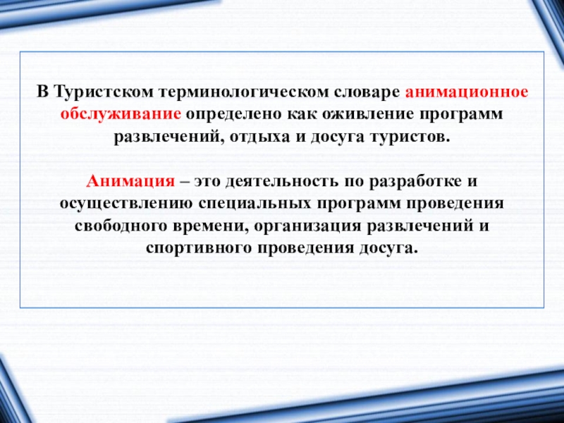 В Туристском терминологическом словаре анимационное обслуживание определено как оживление программ развлечений, отдыха и досуга туристов. Анимация – это деятельность по разработке и осуществлению специальных программ проведения свободного времени, организация развлечений и спортивного проведения досуга.