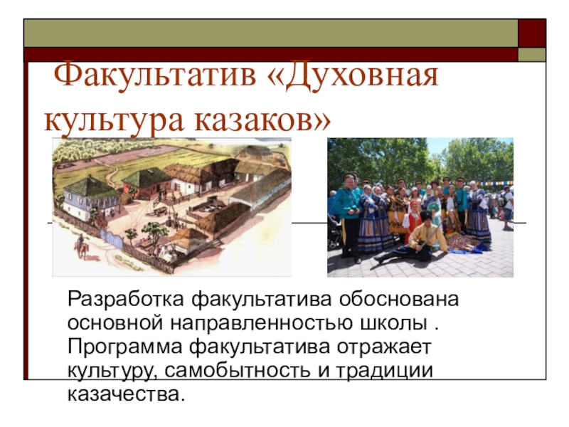 Разработка факультатива обоснована основной направленностью школы . Программа факультатива отражает культуру, самобытность и традиции казачества.
