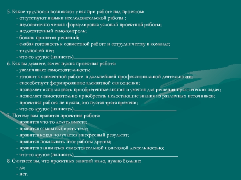 Слайд 145. Какие трудности возникают у вас при работе над проектом: