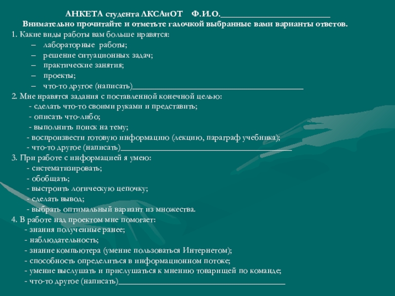 Слайд 13 АНКЕТА студента ЛКСАиОТ Ф.И.О._________________________
