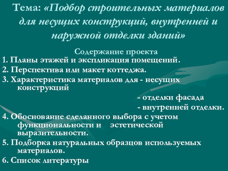 Слайд 11Тема: «Подбор строительных материалов для несущих конструкций, внутренней и наружной отделки