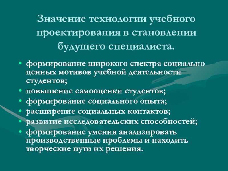 Слайд 20Значение технологии учебного проектирования в становлении будущего специалиста.