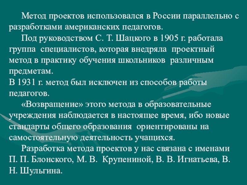 Разработка метода проектов у нас связана с именами П. П. Блонского, М. В. Крупениной, В. В. Игнатьева, В. Н. Шульгина.