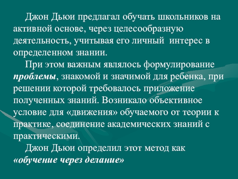 Слайд 5 Джон Дьюи предлагал обучать школьников на активной основе, через целесообразную деятельность,