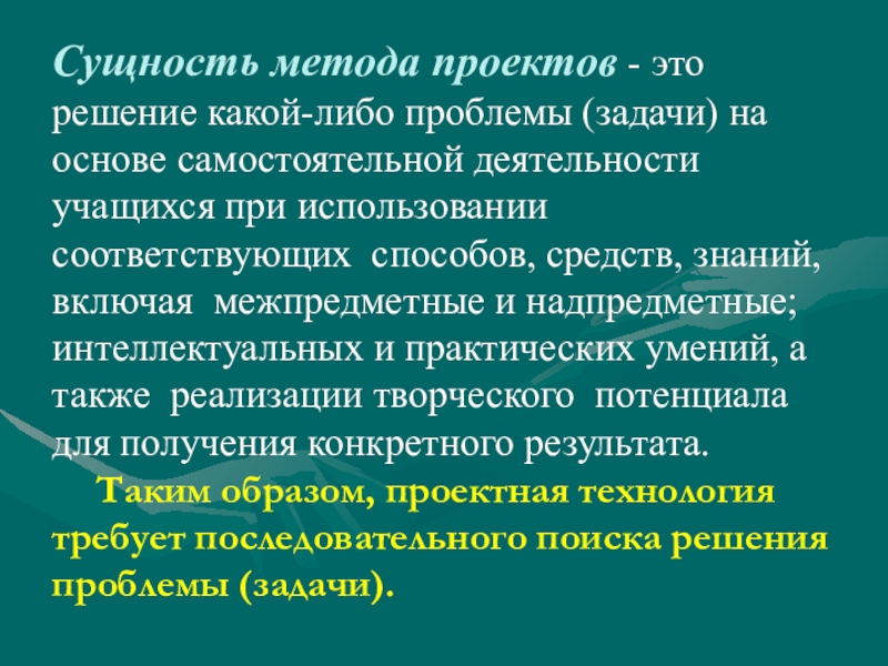 Слайд 7Сущность метода проектов - это решение какой-либо проблемы (задачи) на основе