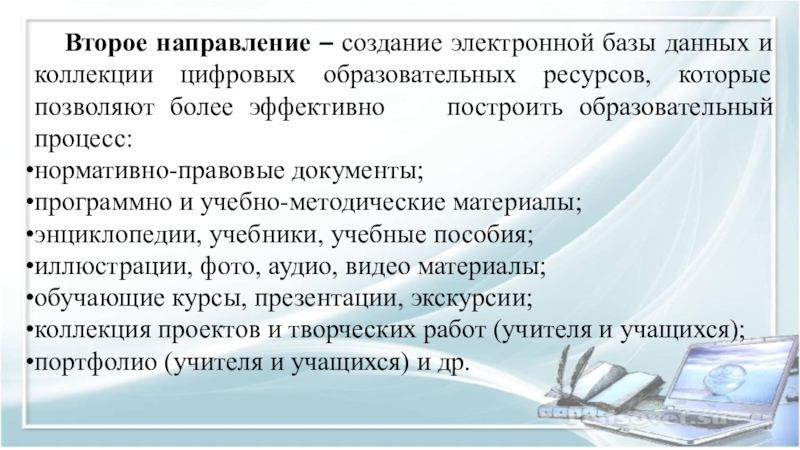 Слайд 11Второе направление – создание электронной базы данных и коллекции цифровых образовательных