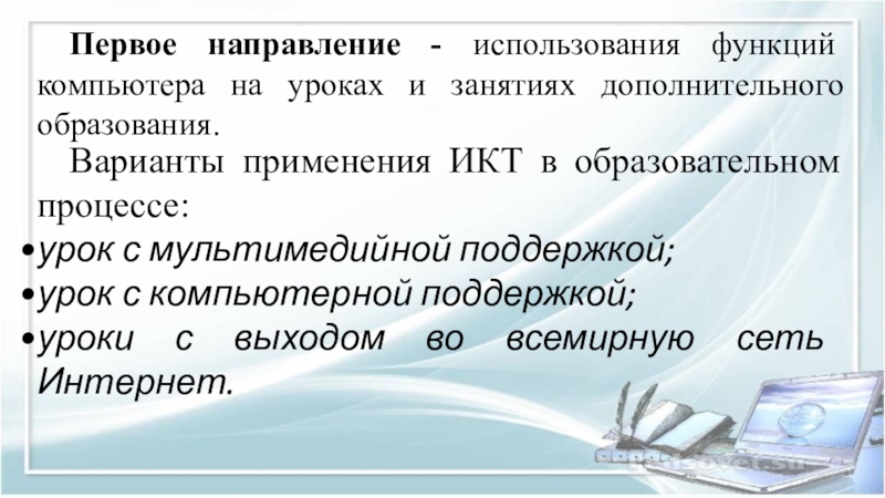 Слайд 9Первое направление - использования функций компьютера на уроках и занятиях дополнительного