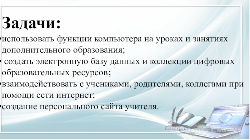 использовать функции компьютера на уроках и занятиях дополнительного образования;