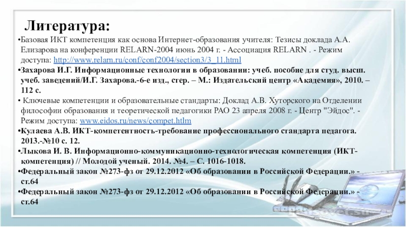 Захарова И.Г. Информационные технологии в образовании: учеб. пособие для студ. высш. учеб. заведений/И.Г. Захарова.-6-е изд., стер. – М.: Издательский центр «Академия», 2010. – 112 с.