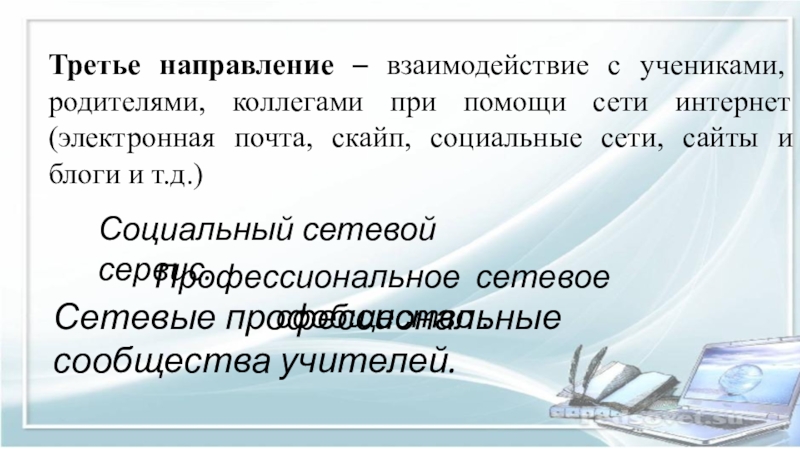 Слайд 12Третье направление – взаимодействие с учениками, родителями, коллегами при помощи сети