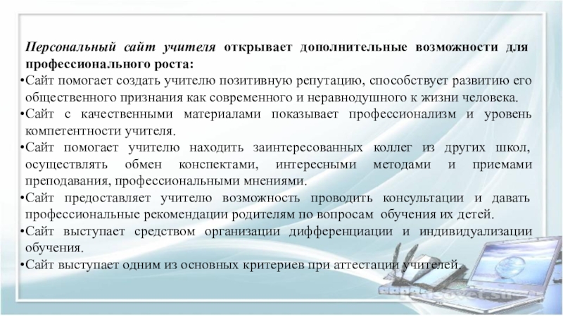 Слайд 13Персональный сайт учителя открывает дополнительные возможности для профессионального роста: