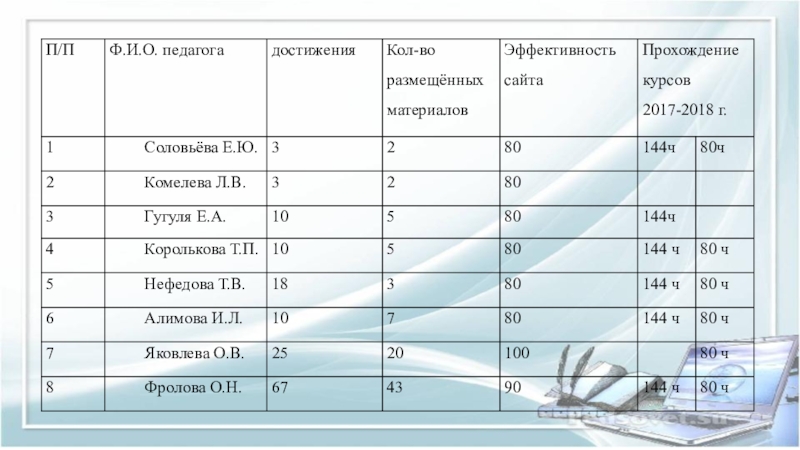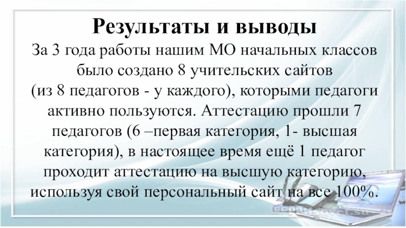 (из 8 педагогов - у каждого), которыми педагоги активно пользуются. Аттестацию прошли 7 педагогов (6 –первая категория, 1- высшая категория), в настоящее время ещё 1 педагог проходит аттестацию на высшую категорию, используя свой персональный сайт на все 100%.