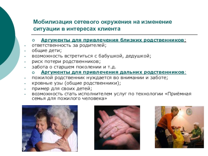 Максимальное вовлечение социального окружения пожилого человека к участию в его жизни, оказанию помощи и поддержки