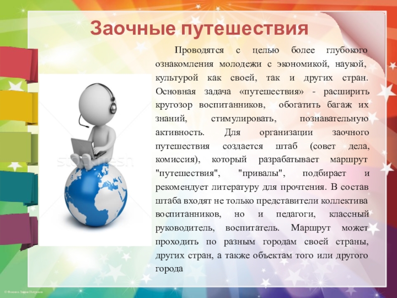 наукой, культурой как своей, так и других стран. Основная задача «путешествия» - расширить кругозop воспитанников, обогатить багаж их знаний, стимулировать, познавательную активность. Для организации заочного путешествия создается штаб (совет дела, комиссия), который разрабатывает маршрут "путешествия", "привалы", подбирает и рекомендует литературу для прочтения. В состав штаба входят не только представители коллектива воспитанников, но и педагоги, классный руководитель, воспитатель. Маршрут может проходить по разным городам своей страны, других стран, а также объектам того или другого города