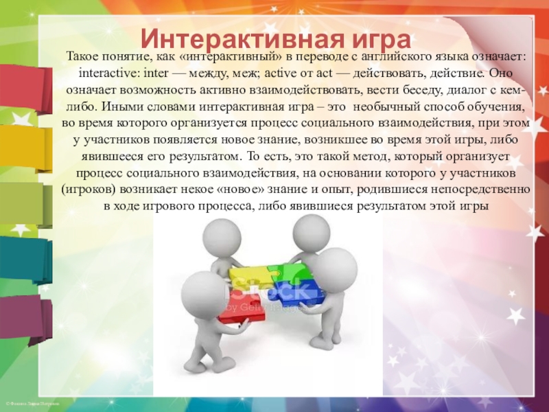 означает: interactive: inter — между, меж; active от act — действовать, действие. Оно означает возможность активно взаимодействовать, вести беседу, диалог с кем-либо. Иными словами интерактивная игра – это необычный способ обучения, во время которого организуется процесс социального взаимодействия, при этом у участников появляется новое знание, возникшее во время этой игры, либо явившееся его результатом. То есть, это такой метод, который организует процесс социального взаимодействия, на основании которого у участников (игроков) возникает некое «новое» знание и опыт, родившиеся непосредственно в ходе игрового процесса, либо явившиеся результатом этой игры