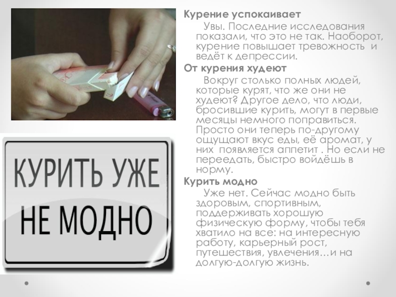 Вокруг столько полных людей, которые курят, что же они не худеют? Другое дело, что люди, бросившие курить, могут в первые месяцы немного поправиться. Просто они теперь по-другому ощущают вкус еды, её аромат, у них появляется аппетит . Но если не переедать, быстро войдёшь в норму.