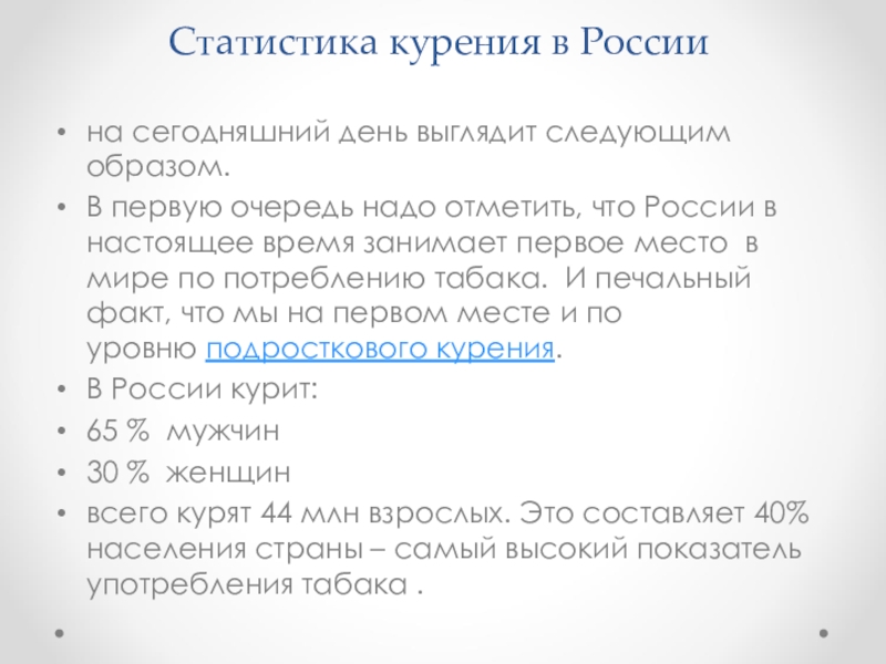 надо отметить, что России в настоящее время занимает первое место в мире по потреблению табака. И печальный факт, что мы на первом месте и по уровню подросткового курения.