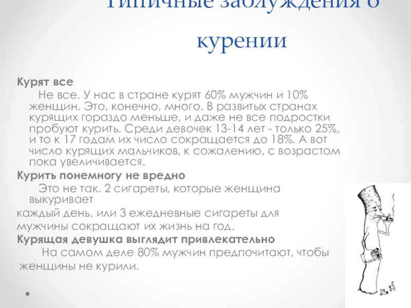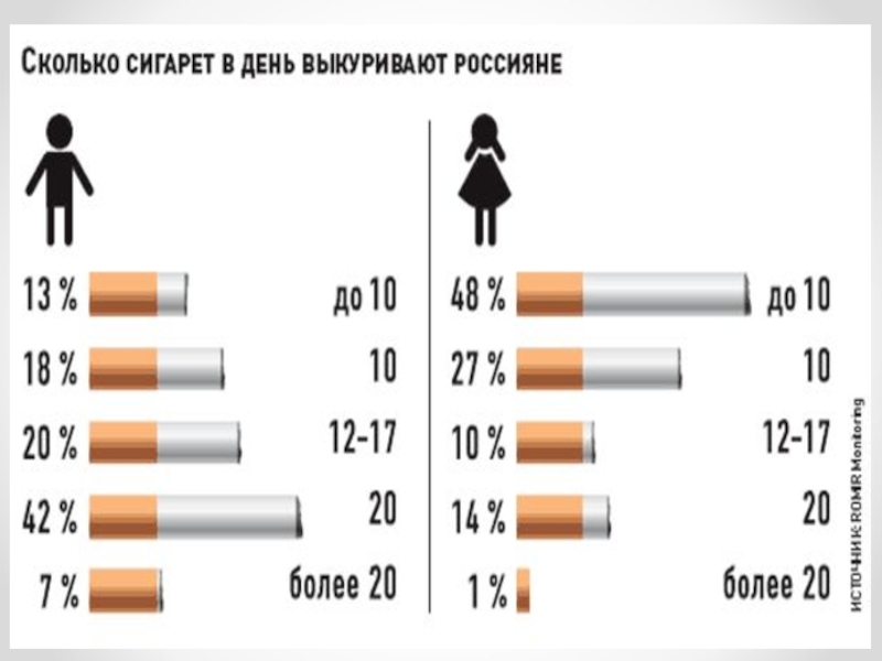 нас в стране курят 60% мужчин и 10% женщин. Это, конечно, много. В развитых странах курящих гораздо меньше, и даже не все подростки пробуют курить. Среди девочек 13-14 лет - только 25%,и то к 17 годам их число сокращается до 18%. А вот число курящих мальчиков, к сожалению, с возрастом пока увеличивается.