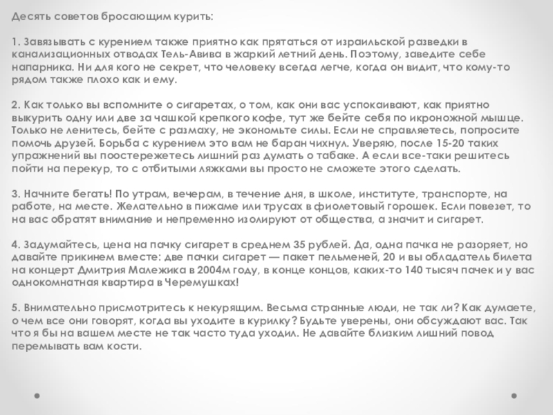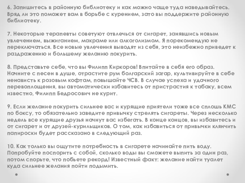 9. Если желание покурить сильнее вас и курящие приятели тоже все сплошь КМС по боксу, то обязательно заведите привычку стрелять сигареты. Через несколько недель все курящие друзья начнут вас избегать. В конце концов, вы избавитесь и от сигарет и от друзей-курильщиков. О том, как избавиться от привычки клянчить папироски будет рассказано в следующий раз.