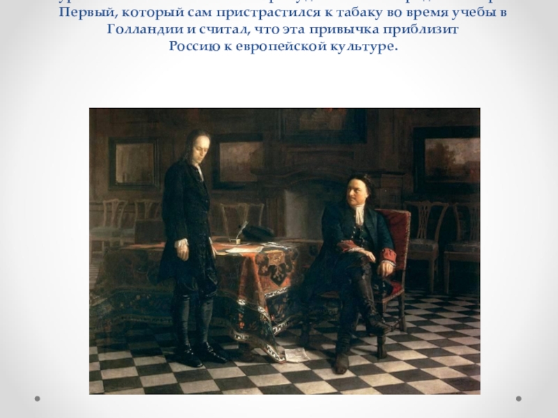 Слайд 4Курение табака в России ввел принудительным порядком Петр Первый, который сам пристрастился
