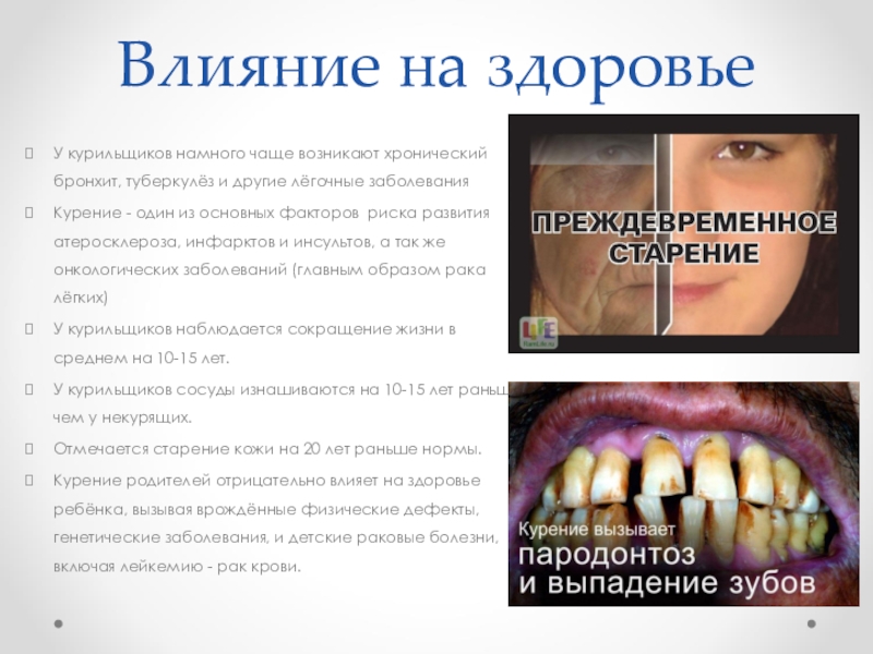 Курение - один из основных факторов риска развития атеросклероза, инфарктов и инсультов, а так же онкологических заболеваний (главным образом рака лёгких)