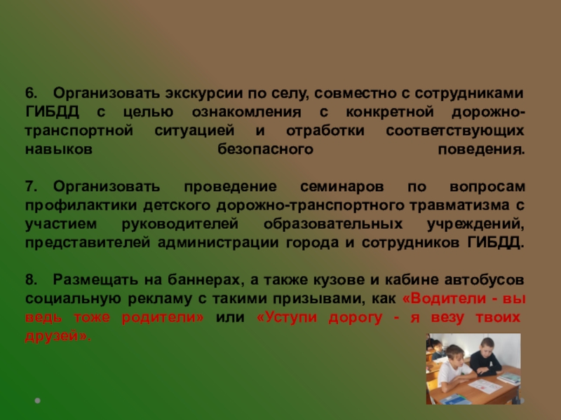 Слайд 456. Организовать экскурсии по селу, совместно с сотрудниками ГИБДД с целью ознакомления
