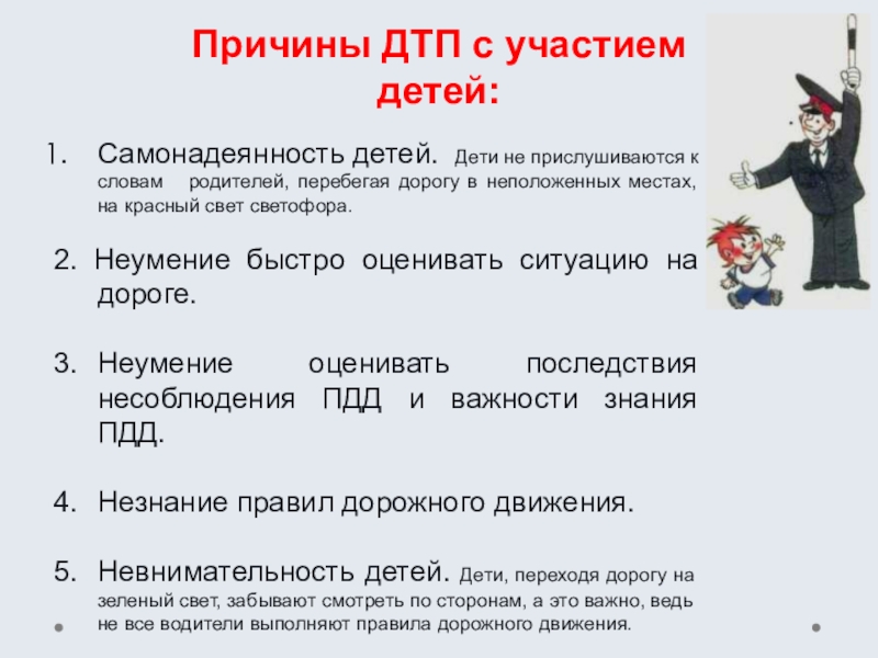 5. Невнимательность детей. Дети, переходя дорогу на зеленый свет, забывают смотреть по сторонам, а это важно, ведь не все водители выполняют правила дорожного движения.