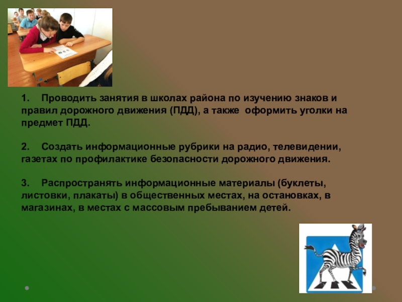 Слайд 431. Проводить занятия в школах района по изучению знаков и правил