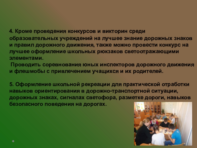 Проводить соревнования юных инспекторов дорожного движения и флешмобы с привлечением учащихся и их родителей.