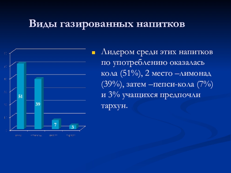 Виды газированных напитковЛидером среди этих напитков по употреблению оказалась кола (51%), 2 место –лимонад (39%), затем –пепси-кола