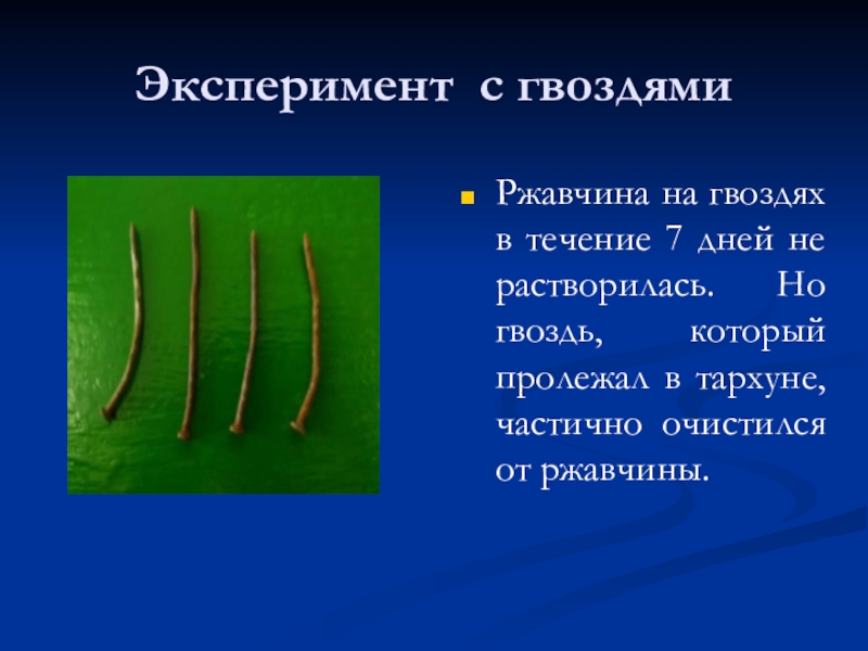 Эксперимент с гвоздямиРжавчина на гвоздях в течение 7 дней не растворилась. Но гвоздь, который пролежал в тархуне,