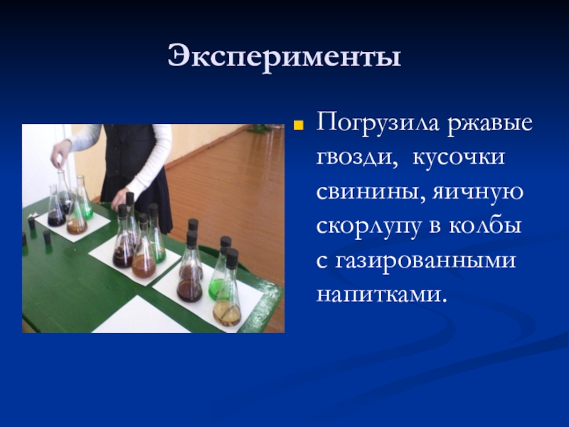 Эксперименты Погрузила ржавые гвозди, кусочки свинины, яичную скорлупу в колбы с газированными напитками.