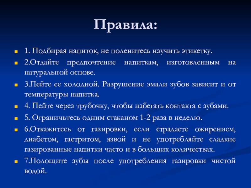 Правила:1. Подбирая напиток, не поленитесь изучить этикетку.2.Отдайте предпочтение напиткам, изготовленным на натуральной основе.3.Пейте ее холодной. Разрушение эмали