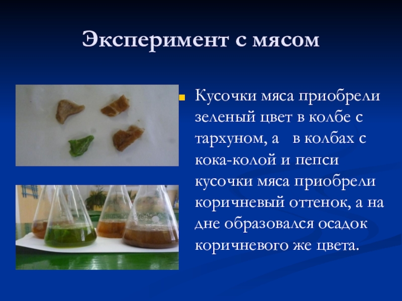Эксперимент с мясомКусочки мяса приобрели зеленый цвет в колбе с тархуном, а  в колбах с кока-колой