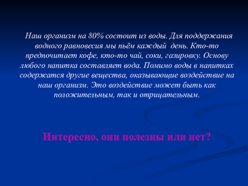 80% состоит из воды. Для поддержания водного равновесия мы пьём каждый день. Кто-то предпочитает кофе, кто-то чай, соки, газировку. Основу любого напитка составляет вода. Помимо воды в напитках содержатся другие вещества, оказывающие воздействие на наш организм. Это воздействие может быть как положительным, так и отрицательным.
