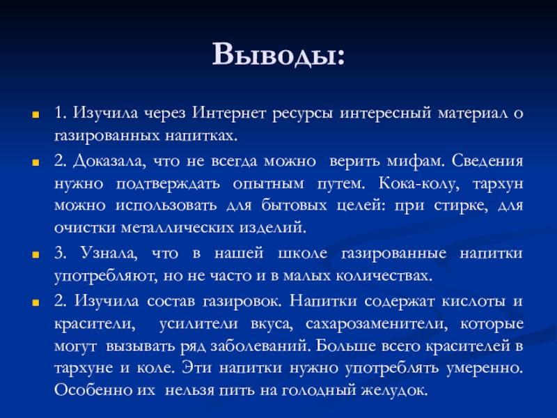 Выводы:1. Изучила через Интернет ресурсы интересный материал о газированных напитках.2. Доказала, что не всегда можно верить мифам.