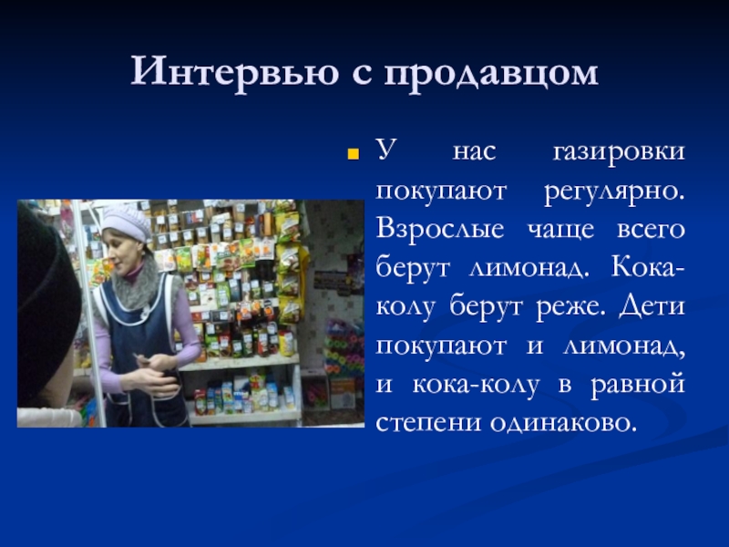 Интервью с продавцом У нас газировки покупают регулярно. Взрослые чаще всего берут лимонад. Кока-колу берут реже. Дети