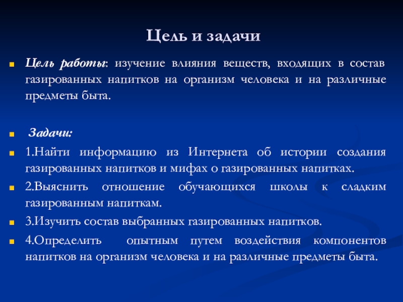 Цель и задачи 	Цель работы: изучение влияния веществ, входящих в состав газированных напитков на организм