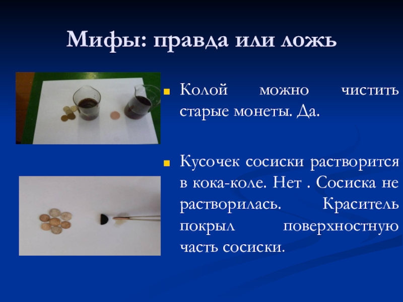 Мифы: правда или ложьКолой можно чистить старые монеты. Да. Кусочек сосиски растворится в кока-коле. Нет . Сосиска