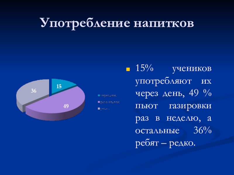 Употребление напитков15% учеников употребляют их через день, 49 % пьют газировки раз в неделю, а остальные 36%