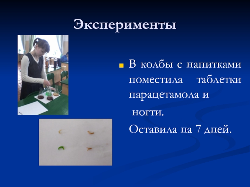 ЭкспериментыВ колбы с напитками поместила таблетки парацетамола и   ногти.   Оставила на 7 дней.