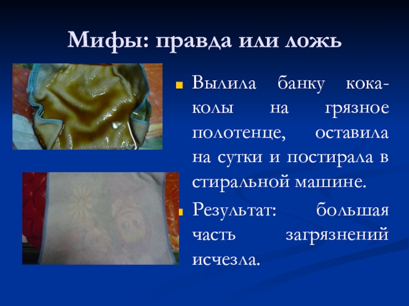 Мифы: правда или ложь Вылила банку кока-колы на грязное полотенце, оставила на сутки и постирала в стиральной