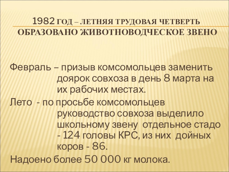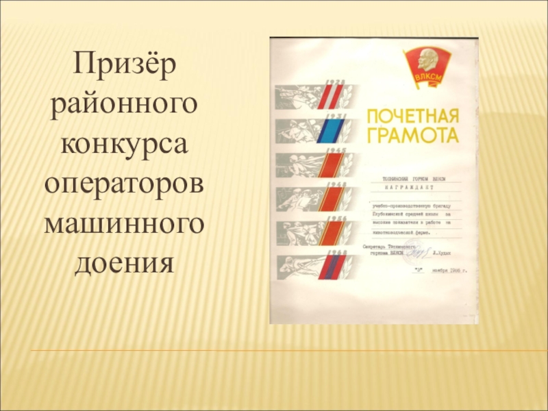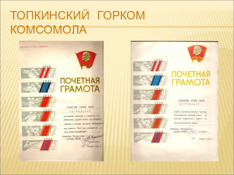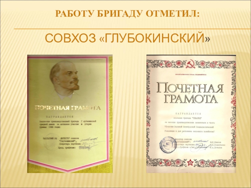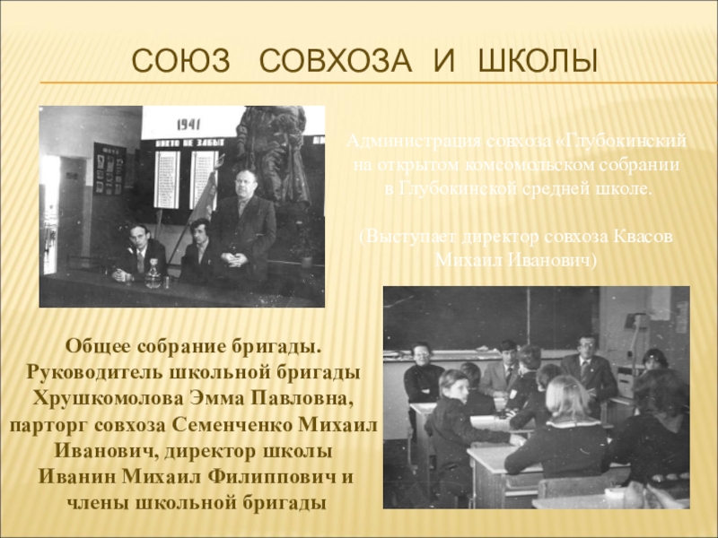 Руководитель школьной бригады Хрушкомолова Эмма Павловна, парторг совхоза Семенченко Михаил Иванович, директор школы